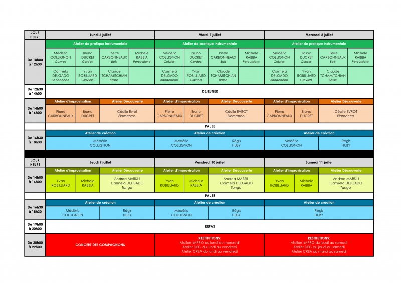 À cela s'ajoutent un concert des compagnons et deux soirées de restitution des ateliers, pour célébrer ensemble une semaine d’exploration et de partage musical.
