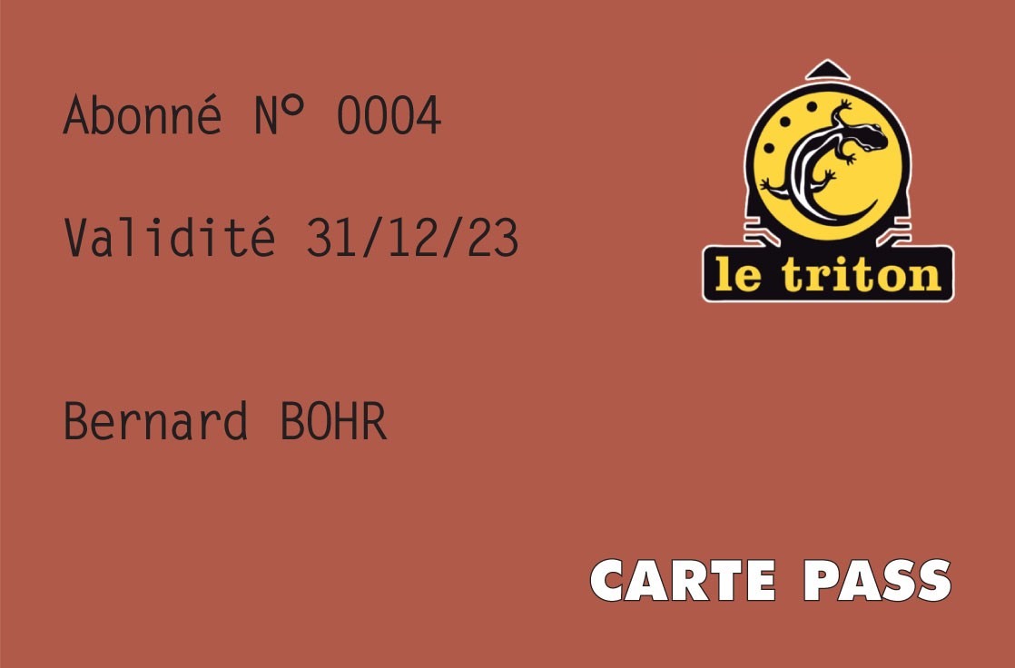 L'adhésion "PASS" est strictement personnelle et valable un an de date à date. Elle permet de bénéficier de tous les avantages liés à l'adhésion. Elle donne accès librement à tous les concerts du Triton (sauf tarifs F et S) dans la limite des places disponibles. Les billets doivent être réservés par téléphone et retirés à la billetterie sur présentation de la carte.