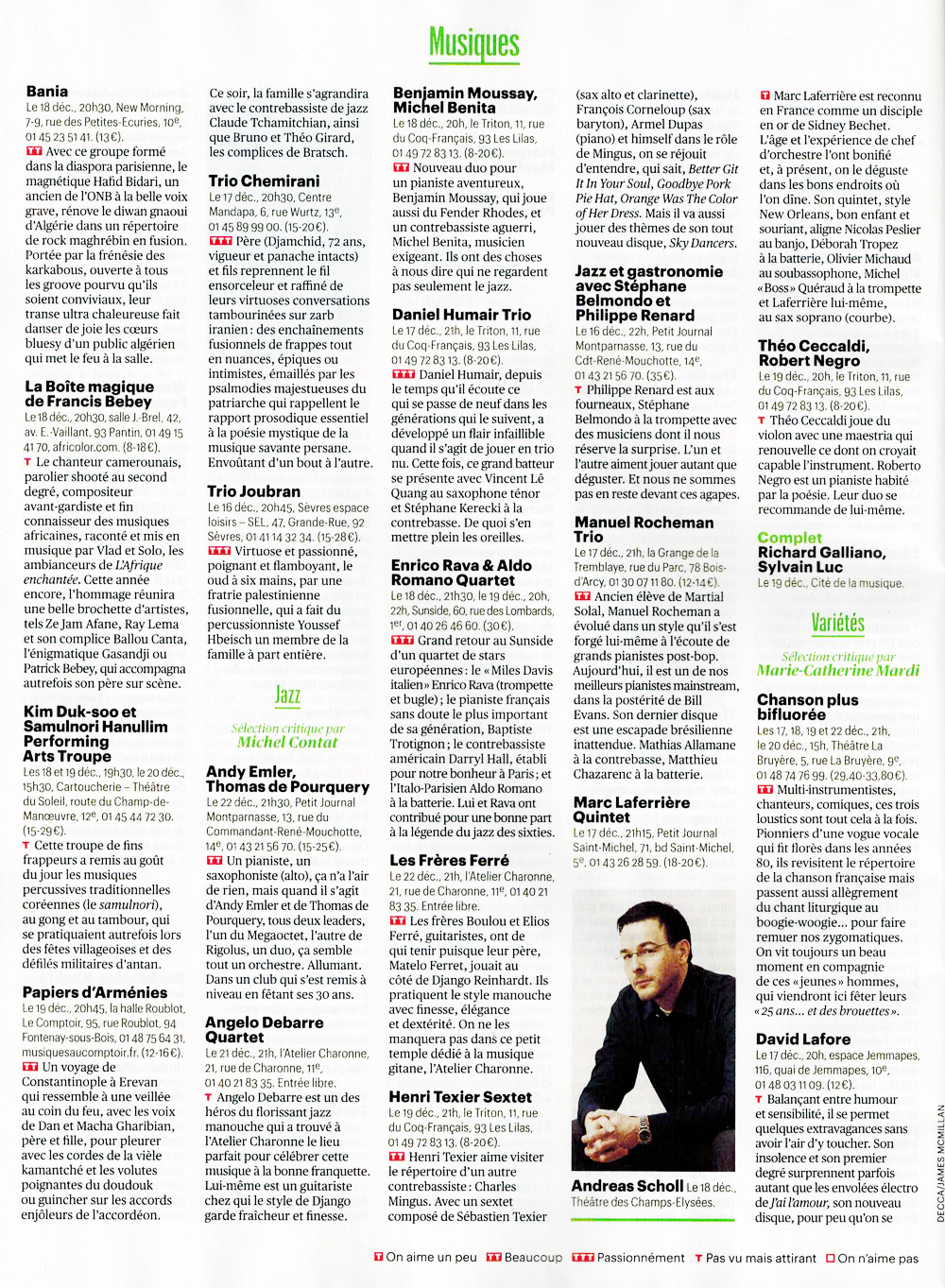 Guide critique - Benjamin Moussay, Michel Benita / Daniel Humair Trio / Henri Texier Sextet / Théo Ceccaldi, Roberto Negro - 16/12/2015