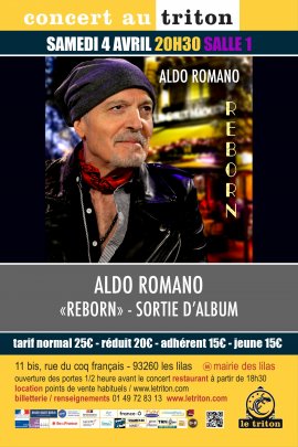 Le premier set mettra en lumière Henri Texier, contrebasse faite homme, partenaire de tant d’aventures autour du monde, l’Afrique, l’Asie... Mais surtout, l’idée de partage de notre musique. Avec nous, bien sûr, Géraldine Laurent, au saxophone, toujours aussi brillante. Au deuxième set, vous entendrez, Enrico Rava, mon frère d’âme de toujours, Baptiste Trotignon, au piano superlatif et à la contrebasse, Darryl Hall qui nous apportera sa rondeur et sa vélocité. Ces musiciens ainsi que Michel Benita, Glenn Ferris, Yoann Loustalot, Mauro Negri et Jasper van’t Hof, vous les retrouverez dans l’album “REBORN” !! Ce soir là, je serai heureux de partager cette musique avec vous, qui serez là, avec nous. » Aldo Romano
