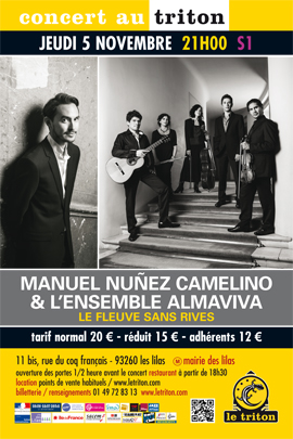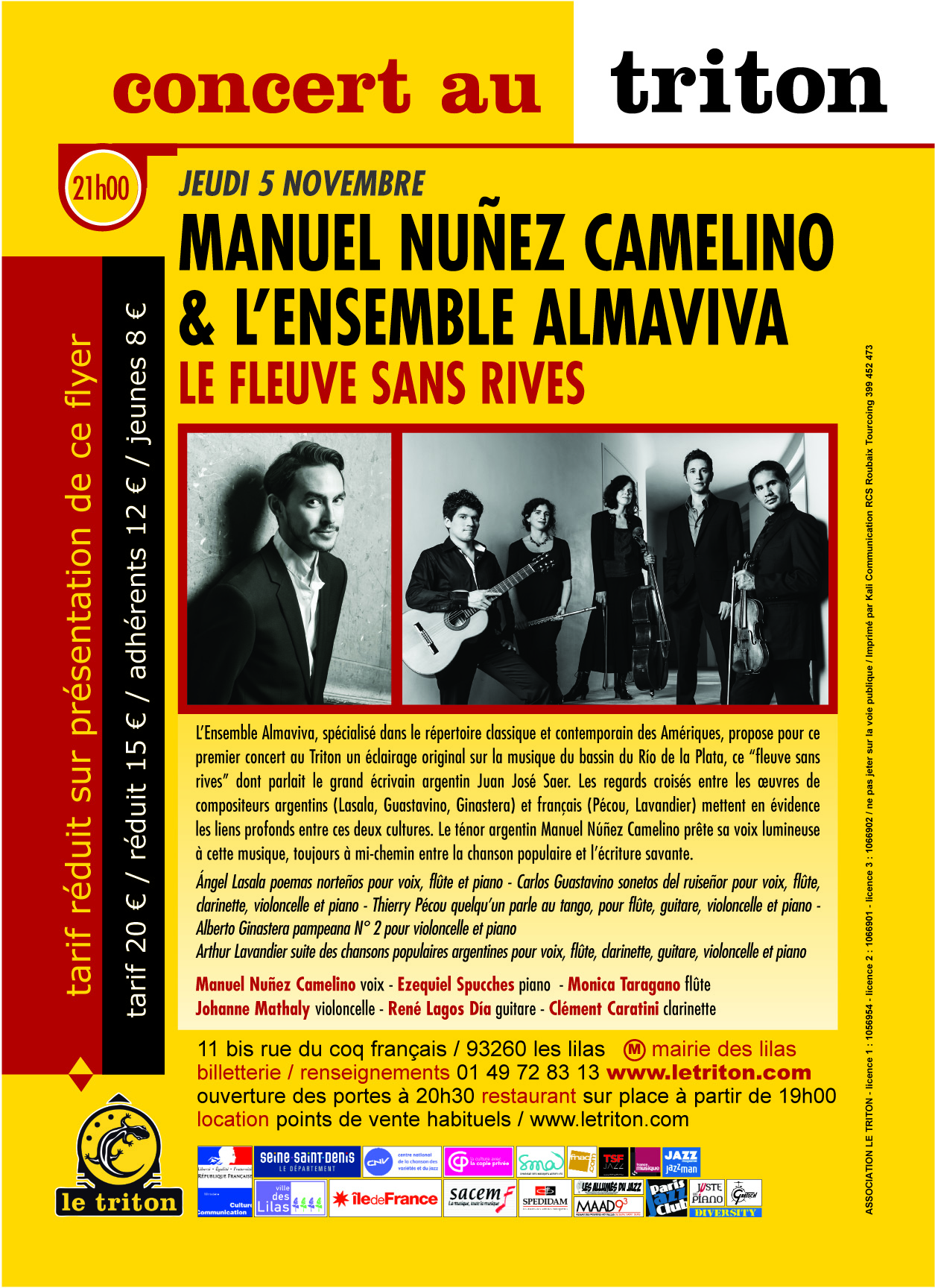 L’Ensemble ALMAVIVA, spécialisé dans le répertoire classique et contemporain des Amériques, propose pour ce premier concert au Triton un éclairage original sur la musique du bassin du Río de la Plata, ce « fleuve sans rives » dont parlait le grand écrivain argentin Juan José Saer. Les regards croisés entre les œuvres de compositeurs argentins (Lasala, Guastavino, Ginastera) et français (Pécou, Lavandier) mettent en évidence les liens profonds entre ces deux cultures. Le ténor argentin Manuel Nuñez Camelino prête sa voix lumineuse à cette musique, toujours à mi-chemin entre la chanson populaire et l’écriture savante.