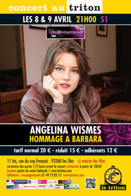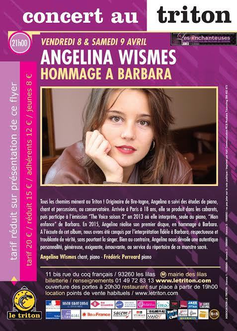 Tous les chemins mènent au Triton ! Originaire de Bretagne, Angelina a suivi des études de piano, chant et percussions, au conservatoire. Arrivée à Paris à 18 ans, elle se produit alors dans les cabarets, puis participe à l'émission "The Voice saison 2" en 2013 où elle interprète, seule au piano, "Mon enfance" de Barbara. En 2015, Angelina réalise son premier disque, en hommage à Barbara. A l’écoute de cet album, nous avons été conquis par l’interprétation fidèle à Barbara, respectueuse et troublante de vérité, sans pourtant la singer. Bien au contraire, Angelina nous dévoile une autentique personnalité, généreuse, exigeante, émouvante, au service du répertoire de ce monstre sacré.
