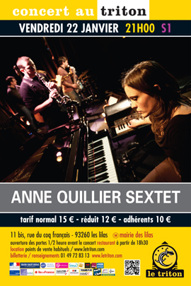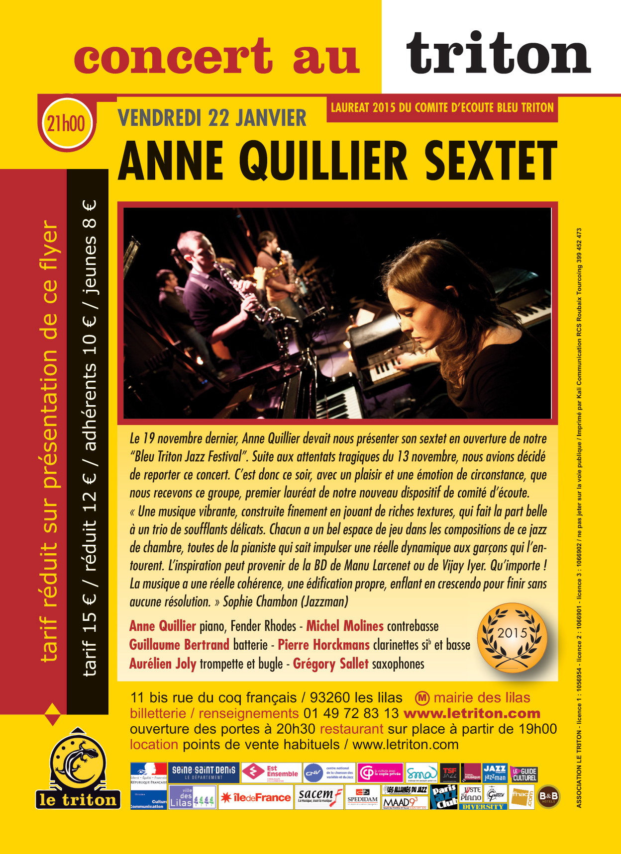 Le 19 novembre dernier, Anne Quillier devait nous présenter son sextet en ouverture de notre “Bleu Triton Jazz Festival”. Suite aux attentats tragiques du 13 novembre, nous avions décidé de reporter ce concert. C’est donc ce soir, avec un plaisir et une émotion de circonstance, que nous recevons ce groupe, premier lauréat de notre nouveau dispositif de comité d’écoute.