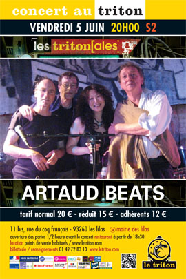 Fondé de manière totalement fortuite en 2009, Artaud Beats est un groupe de rock progressif composé de trois membres du mythique « Henry Cow » - John Greaves, Chris Cutler et Geoff Leigh – ainsi que de Yumi Hara Cawkwell. Au Triton, temple de la musique progressive et de l’Ecole de Canterbury, ce soir, ces quatre-là jouent à domicile… Good vibes !