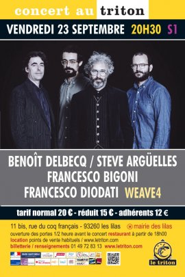Weave4 est un collectif qui réunit deux générations d’artistes internationaux : le binôme Argüelles/Delbecq (Ambitronix, The Recyclers et leurs quelques 30 ans d’inventions), et la paire italienne Bigoni/Diodati qui se trouve à l’épicentre de la jeune scène européenne. Chacun des membres compose pour le collectif. Cette musique est un entrelacement de sons judicieusement organisé qui se transforme au gré des ramifications pulsatives du jeu. Les pièces ne suivent pas forcément de structures préétablies car elles se veulent malléables et flexibles : elles donnent une nouvelle incarnation à l’idée de l’inachevé, de l’objet trouvé qui se recycle sur le vif en d’ingénieux beats colorés.