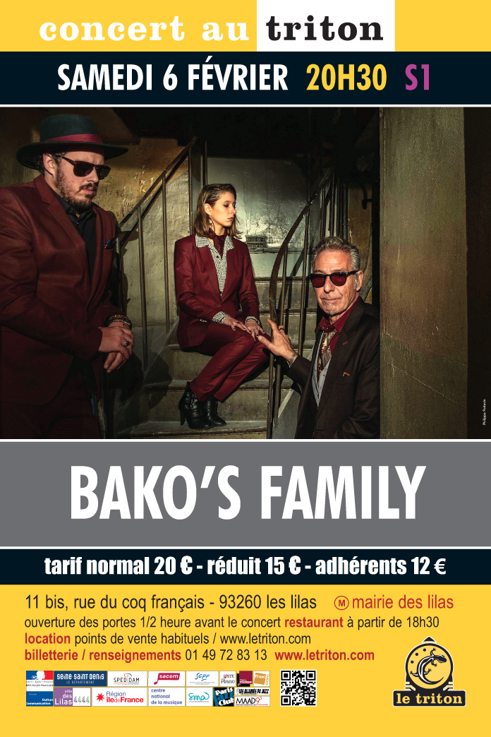 Bako’s Family explore la formule du trio dans ce projet résolument envoûtant et dansant. Mixant pop, électro sans jamais se départir du Blues, ils proposent un répertoire fougueux et passionné. Composé de l’harmoniste chanteur Pascal “Bako” Mikaelian, éminent instrumentiste (trophée France Blues 98), Lucile Kael, chanteuse au timbre unique et prenant, artiste sampler... épaulés de Jonathan Chabbey, jeune guitariste au Blues époustouflant. Novateurs et architectes, Bako’s Family propose un renouvellement, capable d’ improvisations folles et de transes organiques. À cela se mêle une subtile alchimie graphique entre photo, peinture et film. Osmose et liberté totale annoncent d’ores et déjà une musique inattendue.