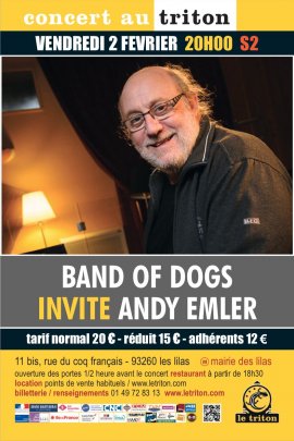 Depuis plus de deux ans, Band of Dogs, le duo composé de Philippe Gleizes et Jean-Philippe Morel, invite des solistes sur la scène du Triton. Après quelques huit rencontres et un album enregistré sur notre label, les voilà de retour cette année pour une nouvelle série de trios inédits, éclectiques, improbables et décoiffants. Ce soir, c’est Andy Emler, pianiste, compositeur, chef d’orchestre et compagnon en résidence au Triton, qu’ils ont décidé d’inviter. Pour l’occasion, Andy vient accompagné de ses claviers d’antan, déterminé à revivre les heures les plus rock’n roll de sa jeunesse !