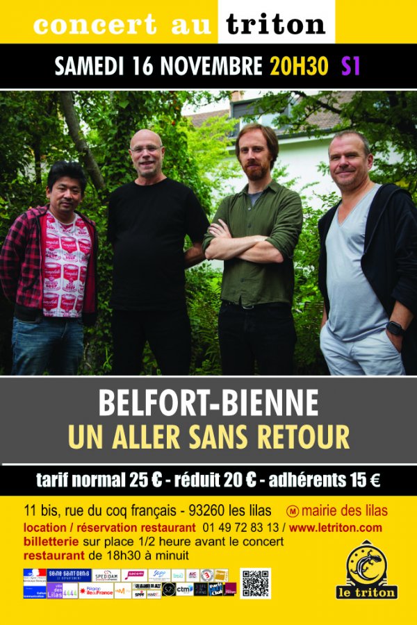 "Belfort - Bienne" est la Bande Originale du roman "Un Aller Sans Retour" de Nicolas Turon. Pendant six mois, Fabrice Bez (le compositeur) et Nicolas Turon (l’auteur) ont voyagé régulièrement dans les rames de la SNCF (en France) et des CFF (en Suisse) entre Belfort et Bienne, ainsi que le long de la voie, dans les villes et villages du territoire de Belfort, des Jura suisse et bernois. Guidés par le hasard, ils ont noirci frénétiquement des carnets de notes, laissant opérer la magie du bouche-à-oreille et de l’anecdote. À partir de la matière ainsi récoltée, l'auteur s’est livré à l’exercice de la rédaction d’un polar – ou, pourrait-on dire, d’un roman de gare. Et c'est pour accompagner le lecteur que Fabrice Bez a imaginé une musique du mouvement qui raconte ce que le roman ne dit pas. Il en résulte un roman policier publié en 2022 dans lequel des flash codes sont présents tout au long des chapitres permettant au lecteur d'écouter la musique inspirée par le récit. Ce sont tous les thèmes de cette B.O. et les improvisations qui les relient que les quatre musiciens, que notre public connaît bien, présentent sur scène ce soir !