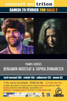 « J’ai toujours admiré le travail de Sophia Domancich. Son sens poétique, son énergie, sa sonorité, et son approche de la composition et de l’improvisation sont pour moi des sources d’inspiration. C’est donc avec impatience et excitation que j’attends cette rencontre autour de deux pianos, occasion rare et précieuse de croiser nos univers musicaux en toute liberté. » Benjamin Moussay