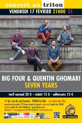 Sur un tout nouveau répertoire intitulé « Seven Years » récemment enregistré live au Triton, les quatre comparses de Big Four sont rejoints par le talentueux trompettiste Quentin Ghomari.« Seven Years » entend célébrer sept années de fructueuses collaborations entre ces musiciens qui ont commencé à jouer ensemble au printemps 2009. Sept ans pour expérimenter et mettre en forme la musique de Julien Soro, pour enregistrer 4 disques et permettre des voyages et rencontres improbables. Sept ans pour souder un collectif qui cherche à aller toujours plus loin dans l’improvisation et dans l’exploration sonore de cette instrumentation si particulière.