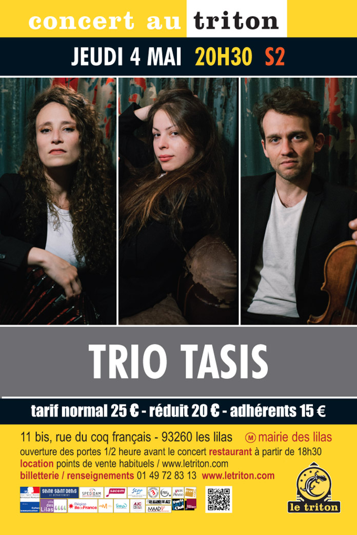 Voilà plus de dix ans que Carmela Delgado, Emilie Aridon-Kociołek et Mathias Naon partagent et renouvellent leur complicité au sein de nombreux projets et grands ensembles de tango. Aujourd’hui naît l’envie de créer à eux trois une formation, minimaliste, intime, au plus près des touches et des cordes. Trois instruments, bandonéon, piano, violon, et une rencontre, enracinée dans le tango et tournée vers de nouveaux horizons. Sortir de Buenos Aires, s’inspirer de tout ce qui les entoure ici et là-bas : la musique argentine vaste comme son territoire, la chanson française, les rythmes d’Amérique latine, le jazz... C’est sous la plume de l’arrangeur compositeur Mathias Naon et dans les laboratoires de recherche musicale qu’ils partagent, que naît aujourd’hui leur singularité, au croisement de la tradition et de l’exploration. Ce soir, le Trio Tasis fête sa création sur la scène du Triton, un lieu qui fait sens pour cet évènement après les nombreux concerts et moments partagés par les trois musiciens entre ces murs.
