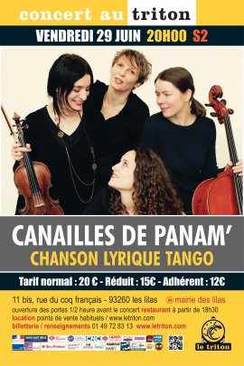 Canailles de Panam’ est un projet au métissage atypique ou se rencontrent voix lyrique, chanson populaire française et esthétique tango autour d’interprétations originales de chansons d’Edith Piaf, Jacques Brel et Léo Ferré arrangées pour l’occasion par Chloë Pfeiffer, Léonardo Teruggi et Roger Helou pour mezzo-soprano, violon, violoncelle et bandonéon. Les musiciennes Anne Le Pape, Carmela Delgado et Sabine Balasse jouent régulièrement ensemble au sein de plusieurs ensembles de Tango (Las Malenas, Orquestra Silbando...). Avec Joanne Calmel elles se connaissent depuis plusieurs années. L’envie d’un projet commun a toujours été présente : grâce à Canailles de Panam’, elle se concrétise et prend forme autour d’une formation aussi singulière qu’inattendue.