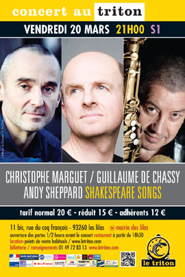 Grands lecteurs de Shakespeare, Christophe Marguet et Guillaume de Chassy se sont plongés dans l’univers du dramaturge pour y chercher un nouveau ferment à leur art de la narration musicale. Leurs “Shakespeare Songs” sont une galerie de portraits musicaux, scénarisée comme une déambulation onirique, à laquelle se joint Andy Sheppard, saxophoniste historique et grand poète du jazz européen. Chaque titre, par son climat musical et ses développements improvisés, donne vie à un personnage remarquable de l’illustre dramaturge Anglais. Ainsi sont évoquées tour à tour les figures d’Hamlet, Cordelia, Perdita, Macbeth, Juliette, Othello, Prospero, Caliban... Marguet et de Chassy rendent beaucoup plus qu'un simple hommage au dramaturge, ils vont y chercher les intensités premières des sentiments et des situations, au point que cette musique semble baignée d'une clarté et d'une charge symbolique inédites pour un trio de jazz.
