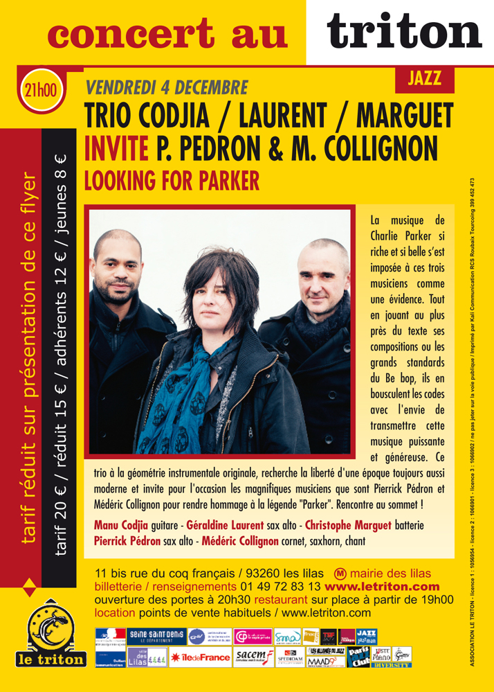 La musique de Charlie Parker si riche et si belle s’est imposée à ces trois musiciens comme une évidence. Tout en jouant au plus près du texte ses compositions ou les grands standards du Be bop, ils en bousculent les codes avec l'envie de transmettre cette musique puissante et généreuse. Ce trio à la géométrie instrumentale originale, recherche la liberté d'une époque toujours aussi moderne et invite pour l'occasion les magnifiques musiciens que sont Pierrick Pédron et Médéric Collignon pour rendre hommage à la légende "Parker". Rencontre au sommet !
