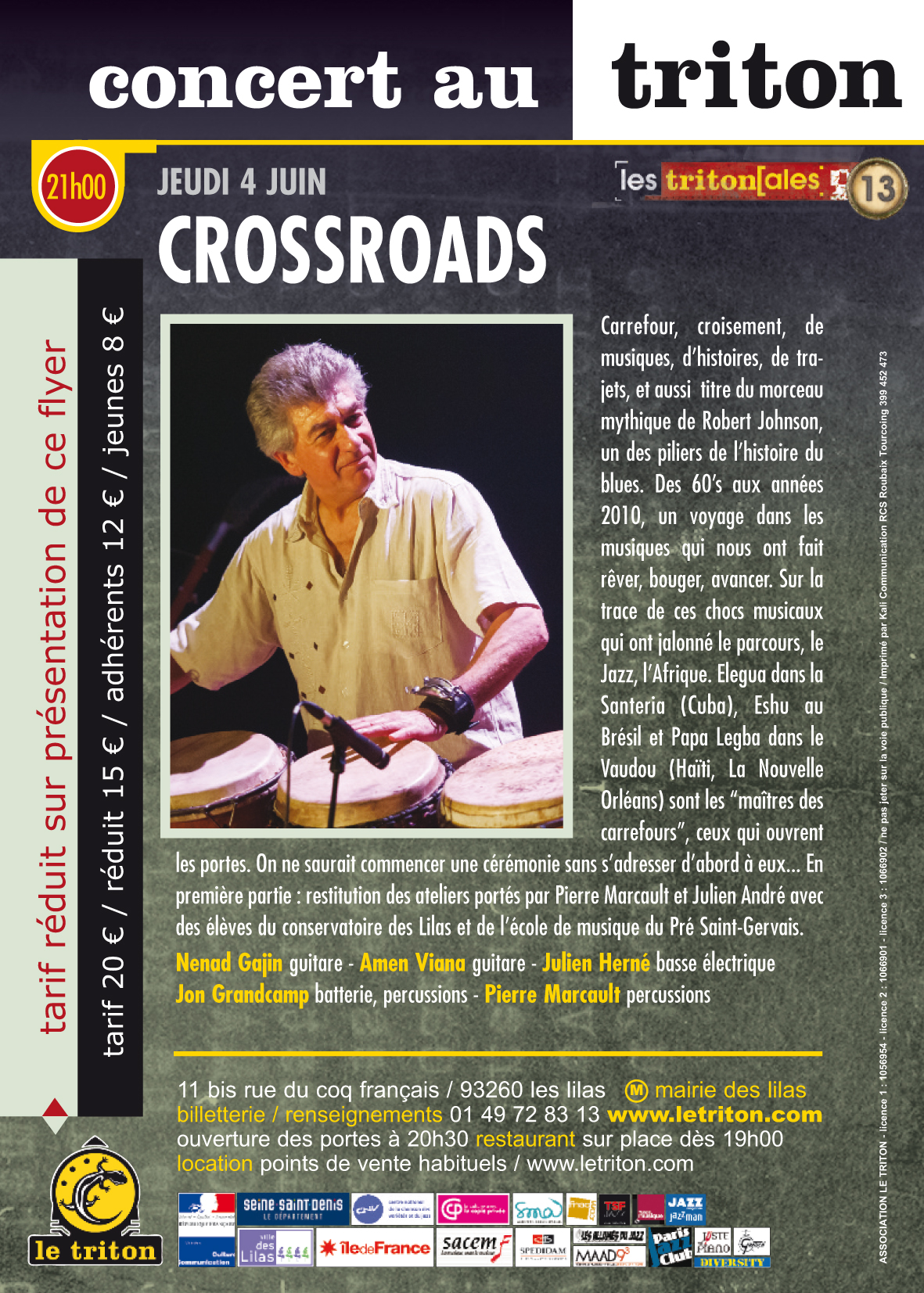 Carrefour, croisement, de musiques, d’histoires, de trajets, et aussi titre du morceau mythique de Robert Johnson, un des piliers de l’histoire du blues. Des 60’s aux années 2010, un voyage dans les musiques qui nous ont fait rêver, bouger, avancer. Sur la trace de ces chocs musicaux qui ont jalonné le parcours, le Jazz, l’Afrique. Elegua dans la Santeria (Cuba), Eshu au Brésil et Papa Legba dans le Vaudou (Haïti, La Nouvelle Orléans) sont les “maîtres des carrefours”, ceux qui ouvrent les portes. On ne saurait commencer une cérémonie sans s’adresser d’abord à eux...