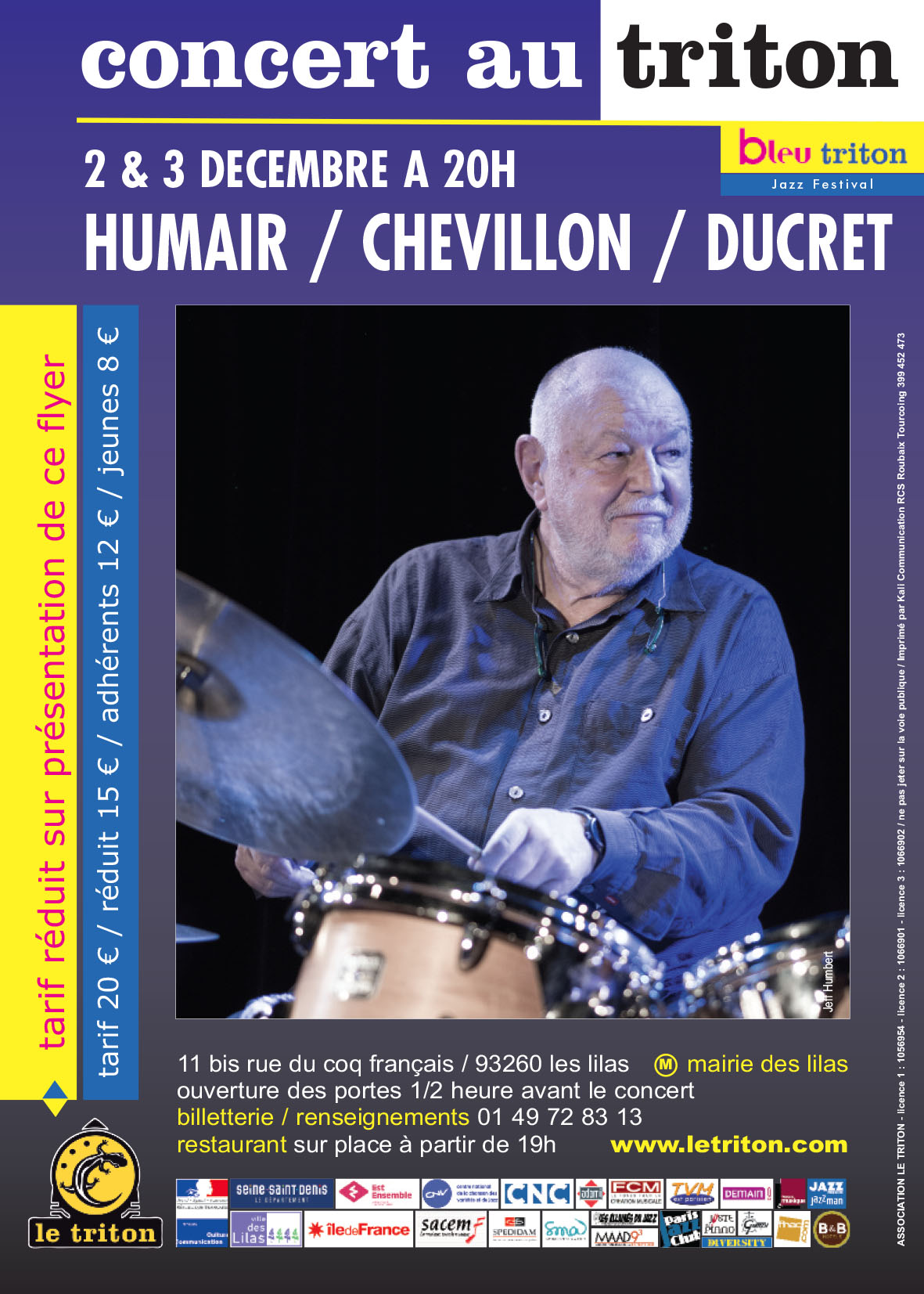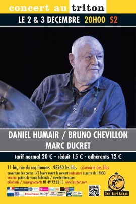 Daniel Humair, Bruno Chevillon et Marc Ducret sont trois véritables monstres sacrés du jazz français, européen et du monde de la musique improvisée en général. Après des années à avoir joué ensemble au sein de ce trio de gala, leurs chemins se sont éloignés, enfin pas tout à fait puisqu’ils ont continué à partager les scènes mais plus sous cette forme spécifique à trois. A l’occasion de ces deux concerts au Triton, ils se retrouvent en trio, pour un programme où liberté extrême et plaisir maximum seront les règles du jeu…