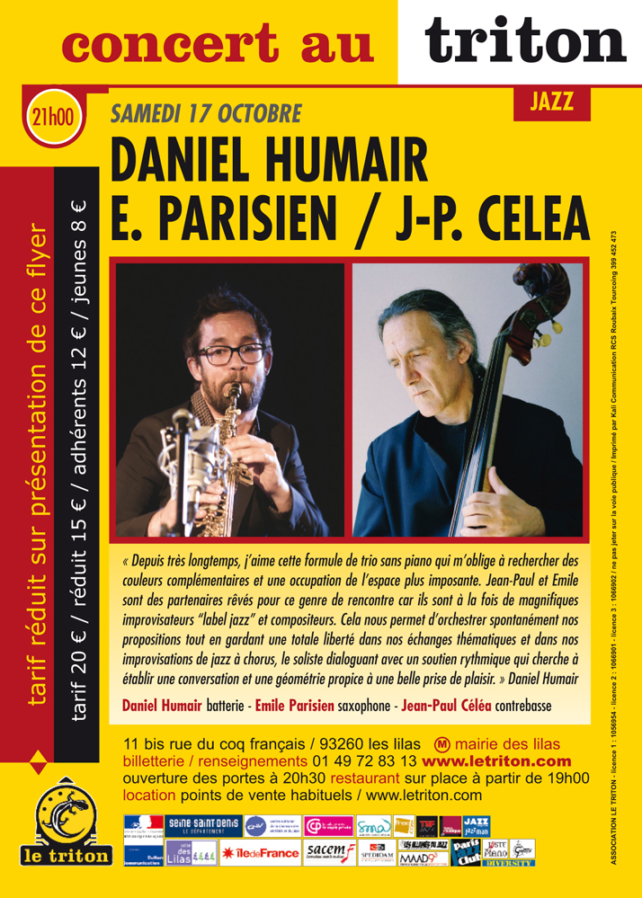 « Depuis très longtemps, j’aime cette formule de trio sans piano qui m’oblige à rechercher des couleurs complémentaires et une occupation de l’espace plus imposante. Jean Paul et Emile sont des partenaires rêvés pour ce genre de rencontre car ils sont à la fois de magnifiques improvisateurs label jazz et compositeurs et cela nous permet d’orchestrer spontanément nos propositions tout en gardant une totale liberté dans nos échanges thématiques et dans nos improvisations de jazz à chorus, le soliste dialoguant avec un soutien rythmique qui cherche à établir une conversation et une géométrie propice à une belle prise de plaisir. »