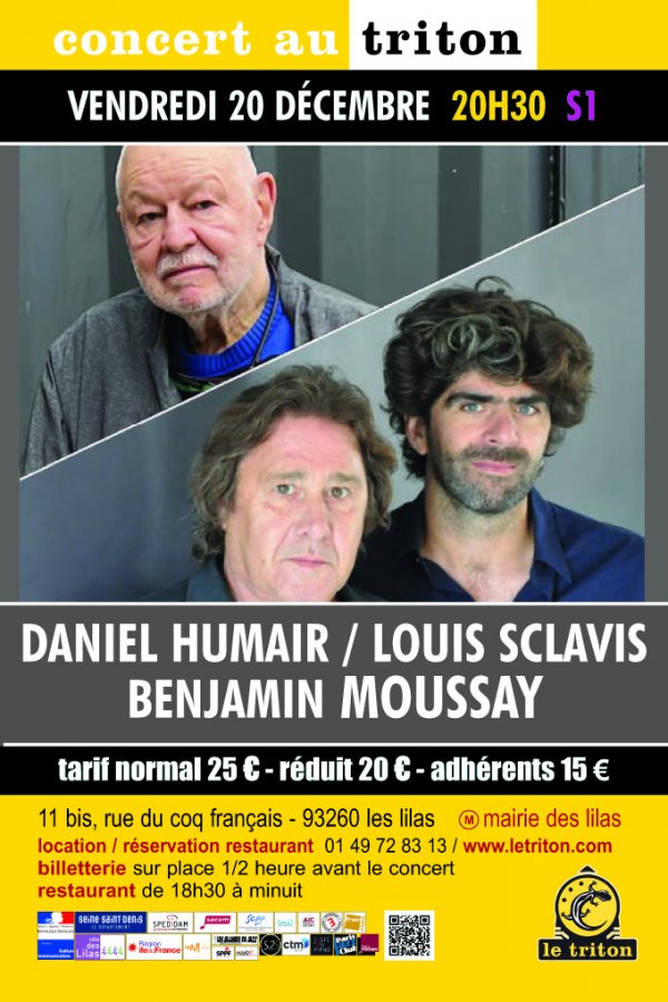 Louis Sclavis a une histoire ancienne avec Daniel Humair. Ils se côtoient de façon épisodique depuis les années 1980, en duo, en trio et au sein de certains groupes de Michel Portal. Benjamin Moussay a aussi l’habitude de jouer avec Daniel Humair et l’a invité plusieurs fois pour des concerts en trio, notamment au Triton. Louis et Benjamin, quant à eux, jouent ensemble très régulièrement depuis plus de vingt ans dans de nombreux projets. Ce soir, ils ont eu envie de proposer au maestro Daniel Humair de se joindre à leur duo et de co-construire un répertoire avec leurs compositions respectives. Improvisation virtuose, liberté de jeu et invention en temps réel : voilà trois générations de très grands musiciens qui se retrouvent de façon naturelle et logique pour créer ensemble et continuer leurs propres histoires du jazz.