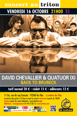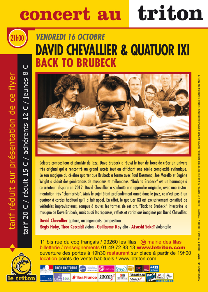 Célèbre compositeur et pianiste de jazz, Dave Brubeck a réussi le tour de force de créer un univers très original, qui a rencontré un grand succès tout en affichant une réelle complexité rythmique. Le son magique du célèbre quartet que Brubeck a formé avec Paul Desmond, Joe Morello et Eugène Wright a séduit des générations de musiciens et mélomanes. « Back to Brubeck » est un hommage à ce créateur, disparu en 2012. David Chevallier a souhaité une approche originale, avec une instrumentation très « chambriste ». Mais le sujet étant profondément ancré dans le jazz, ce n’est pas à un quatuor à cordes habituel qu’il a fait appel. En effet, le quatuor IXI est exclusivement constitué de véritables improvisateurs, rompus à toutes les formes de cet art. « Back to Brubeck » interprète la musique de Dave Brubeck, mais aussi les réponses, reflets et variations imaginés par David Chevallier.