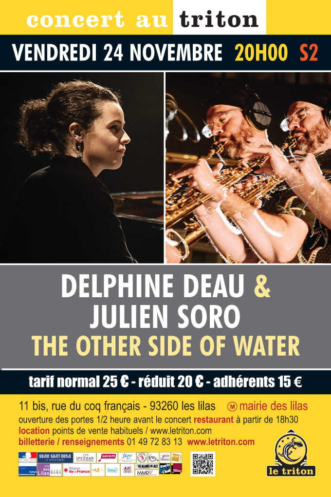 Cette nouvelle création réunissant Delphine Deau, la leadeuse pianiste du 4et Nefertiti et Julien Soro, saxophoniste de l’ONJ et également leader du trio Players, est un terrain d’exploration pour l’improvisation et la composition dans le cadre intime et puissant que constitue le duo piano-saxophone. Observer ce qu’il se trouve et existe « de l’autre côté de l’eau », ce serait passer un peu de l’autre côté de soi-même, retourner ses habitudes et manières de jeu pour inventer d’autres modes d’échanges par le son. Laisser les résonances et le silence faire le travail, observer les reflets sonores et inventer des échos gestuelles pour trouver un rythme commun. Une musique clairement impressionniste et poétique cherchant à s’inscrire dans le sillage des grands duos piano-saxophone de l’histoire moderne du Jazz, de Wayne Shorter et Herbie Hancock à Greg Osby et Marc Copland.