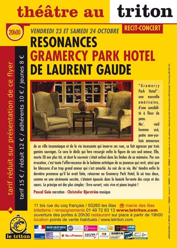 Mo’, vieil homme usé, poète new-yorkais amoureux de sa ville insomniaque et de la vie incessante qui innerve ses rues, se fait agresser par trois gamins sauvages. Ce sera le déclic qui fera resurgir enfin la figure de son seul amour, Ella, morte 30 ans plus tôt, et dont le souvenir s’était enfoui dans les limbes de sa mémoire. Par son évocation, c’est toute l’effervescence de la bohème artistique de sa jeunesse qui revit, ainsi que les blessures d’un trop grand amour qui s’est amoché. Au soir de sa vie, Mo’ tiendra enfin la dernière promesse qu’il lui avait faite, retourner au Gramercy Park Hotel, là où tous deux, comme en une cérémonie secrète, s’étaient épousés dans la beauté fervente des corps et des cœurs. Le principe est des plus simples : livre ouvert, voix vive et piano inspiré !