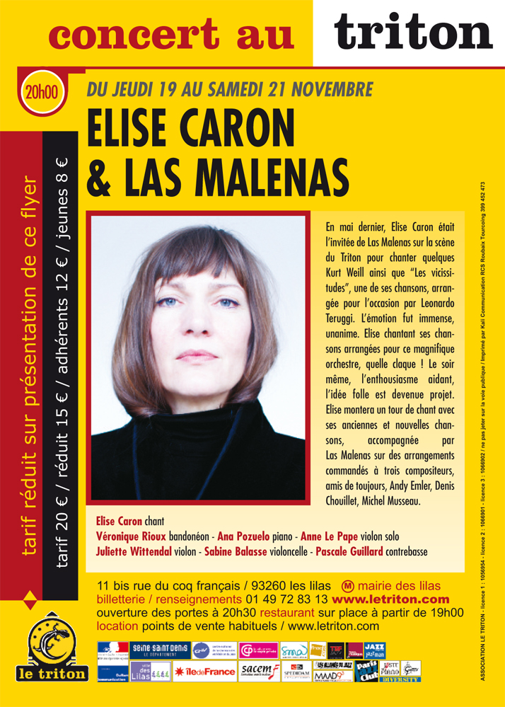 En mai dernier, Elise Caron était l'invitée de Las Malenas sur la scène du Triton pour chanter quelques Kurt Weill ainsi que « Les vicissitudes », une de ses chansons, arrangée pour l’occasion par Leonardo Teruggi. L’émotion fut grande, l’unanimité. Elise chantant ses chansons arrangés pour ce magnifique orchestre, quelle chaque ! Le soir même, l'enthousiasme aidant, l'idée folle est devenue projet. Elise montera un tour de chant avec ses anciennes et nouvelles chansons, accompagnée par Las Malenas sur des arrangements commandés à trois compositeurs, amis de toujours, Andy Emler, Denis Chouillet, Michel Musseau.