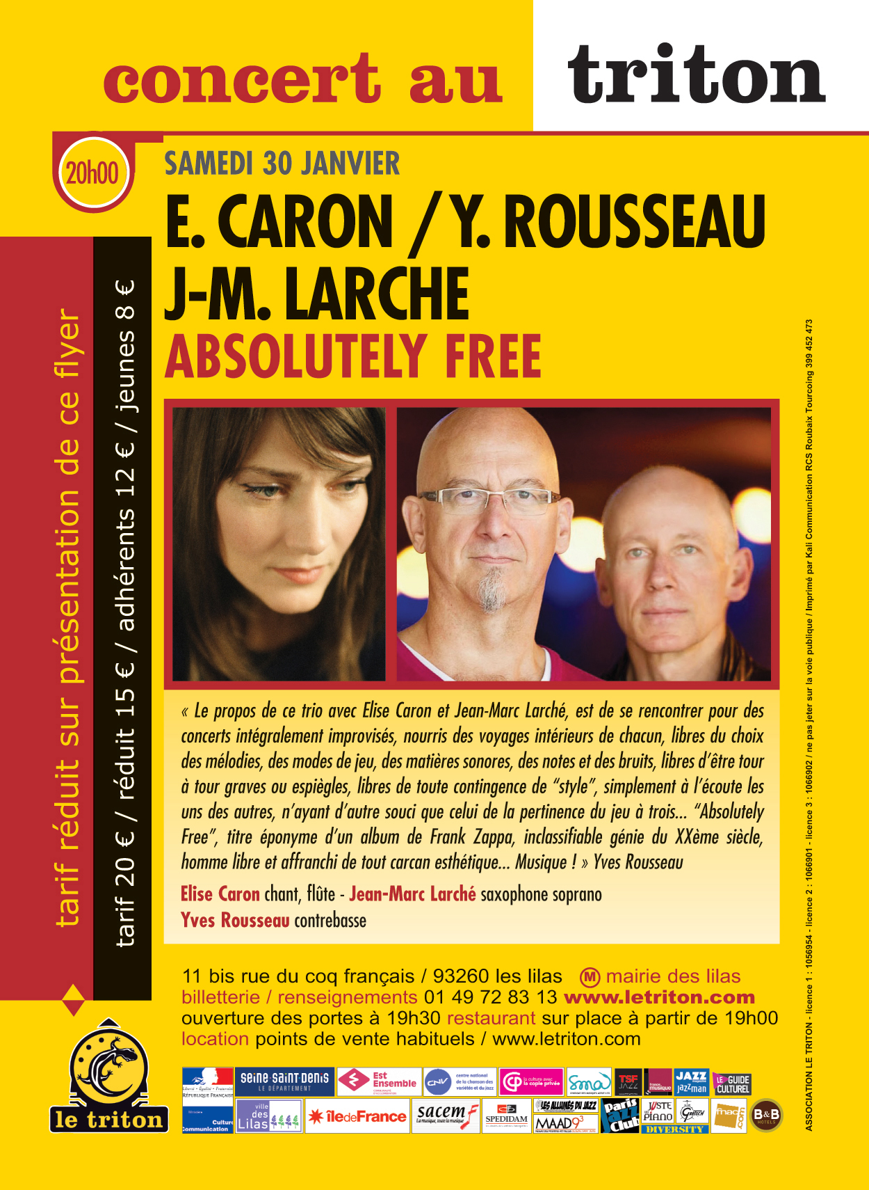 « Le propos de ce trio avec Elise Caron et Jean-Marc Larché, est de se rencontrer pour des concerts intégralement improvisés, nourris des voyages intérieurs de chacun, libres du choix des mélodies, des modes de jeu, des matières sonores, des notes et des bruits, libres d’être tour à tour graves ou espiègles, libres de toute contingence de "style", simplement à l’écoute les uns des autres, n’ayant d’autre souci que celui de la pertinence du jeu à trois… "Absolutely Free", titre éponyme d’un album de Frank Zappa, inclassifiable génie du XXème siècle, homme libre et affranchi de tout carcan esthétique… Musique ! »