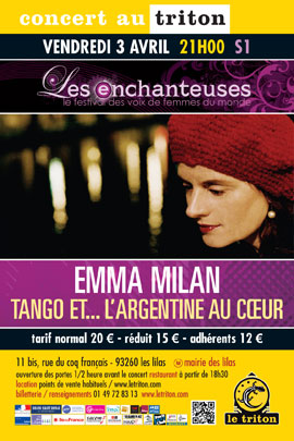 Rien ne destinait Emma Milán au tango chanté, mais le hasard faisant bien les choses, cette amoureuse des mots décida il y a une vingtaine d’années d’engager sa vie et sa voix dans une belle aventure argentine. C’est peut-être justement parce qu’elle n’a pas grandi avec le tango et sa tradition qu’Emma Milán parvient à transmettre une telle émotion dans ses chansons, redoublant de passion pour s’approcher au plus près de l’authentique. Fidèle à ses premières amours, elle poursuit son exploration de la poésie argentine en interprétant des textes d’une vivacité charnelle, généreusement servie par la guitare sensible de Tomás Bordalejo.