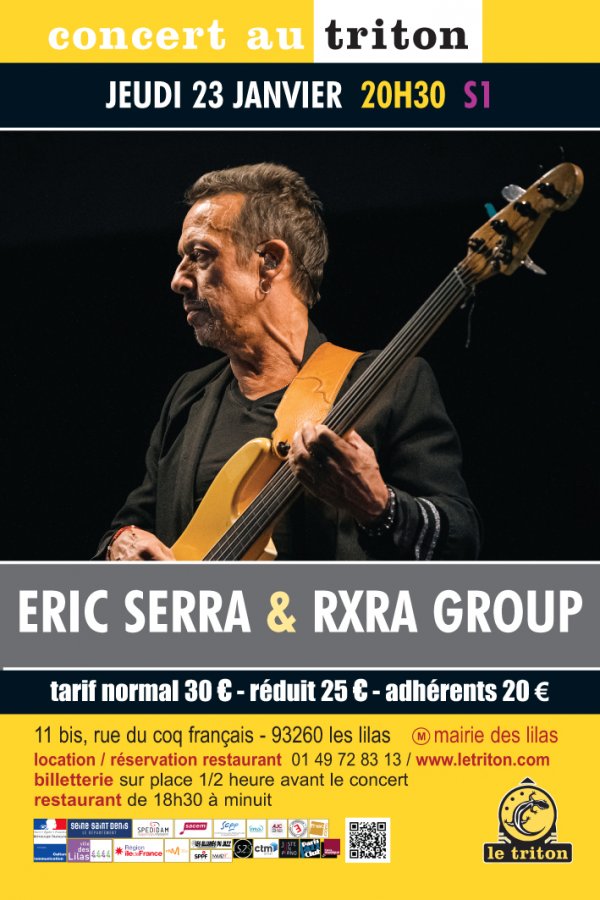 Multi-instrumentiste aux influences exigeantes et diverses (Jaco Pastorius, John McLaughlin, Jeff Beck), Éric Serra se fait, très jeune, un nom de compositeur en travaillant aux côtés de Jacques Higelin, Didier Lockwood, Pierre Jolivet, et évidemment le réalisateur et producteur Luc Besson, dont il devient le compositeur attitré dès 1979. Avec Besson, il remporte 4 Victoires de la meilleure musique de film et un César pour sa mythique bande originale du Grand Bleu. Connu à l’international, Éric Serra parvient néanmoins à cultiver une très plaisante discrétion et demeure fidèle à sa propre musique qu’il aime jouer en live avec son septet de jazz, qui a acquis ses lettres de noblesse. Ce soir, pour notre plus grand bonheur, Éric Serra est de retour au Triton, accompagné du RXRA GROUP ! Si bien entouré, Éric Serra apparaît encore ici dans son Élément, pratiquant son art sans écran de fumée…
