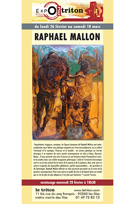 "Inquiétantes, tragiques, comiques, les figures humaines de Raphaël Mallon sont métamorphosées pour libérer une poétique singulière où l'onirisme prédomine, où se mêlent l'artisanal et le mystique, l'humour et la lucidité : un univers plastique où l'artiste témoigne à sa manière de notre société contemporaine en écho à Goya, Daumier, Bacon... Il nous présente une série d’œuvres où son bestiaire côtoie l’humanité et revisite les mythes dans une réalité imaginaire pittoresque. L'éclat et l'intensité chromatique sont ici au service exclusif de la fusion de la poésie et de la peinture. Avec cette mise en scène si originale des épousailles jubilatoires -parfois épouvantables...- du quotidien et du fantastique, Raphaël Mallon affirme un style purement personnel sur la scène de la peinture contemporaine. Pour nous autres en quête de sens et de beauté dans un monde qui en est de plus en plus dépourvu, il est plus que bienvenu !" Laurent Ferraro