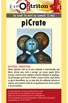 Peintre plasticien actif sur la scène nationale et internationale, coté Akoun, piCrate nous invite à partager son univers peuplé d'êtres étranges, empreint d'une singulière recherche esthétique et graphique. Ses personnages, qu'il nomme “Entités”, passeurs d'âmes, anges déchus ou génies bienveillants, mis en scène dans des ambiances texturées et colorées, sont souvent le reflet de nos questionnements, de nos craintes et de nos émotions.