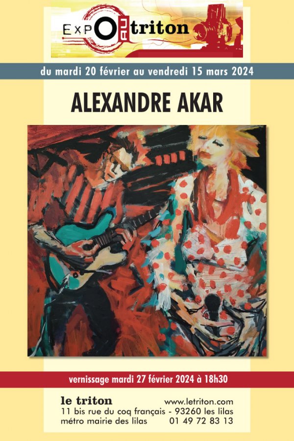 Nous vous présentons quelques peintures et dessins inspirés par ce lieu unique en son genre, ses ambiances, ses instants et ses mouvements. Libre à chacun d'y associer la sonorité qui peut aller avec, à partir de vos souvenirs de concerts ou de pochettes de disque, voire de compositions à venir. Comme un style de vie où tous nos sens doivent toujours être à l'écoute. Alexandre Akar est un plasticien formé à l’École Nationale Supérieure des Arts Appliqués et des Métiers d’Art Olivier de Serres, ayant exposé en France et à l’étranger, et dont l’atelier se situe à Gennevilliers. Sa peinture se situe à mi-chemin entre l’expressionnisme allemand, le fauvisme et le muralisme contemporain.