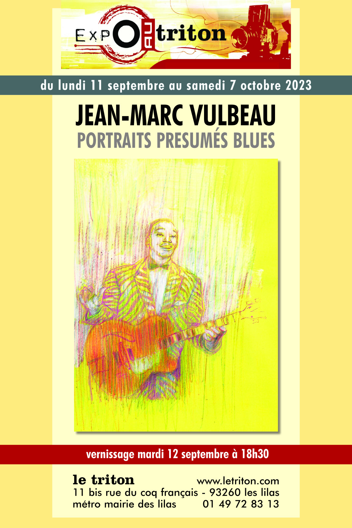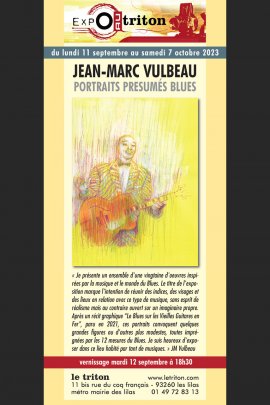 « Je présente un ensemble d'une vingtaine d'oeuvres inspirées par la musique et le monde du Blues. Le titre de l'exposition marque l'intention de réunir des indices, des visages et des lieux en relation avec ce type de musique, sans esprit de réalisme mais au contraire ouvert sur un imaginaire propre. Après un récit graphique « Le Blues sur les Vieilles Guitares en Fer », paru en 2021, ces portraits convoquent quelques grandes figures ou d'autres plus modestes, toutes imprégnées par les 12 mesures du Blues. Je suis heureux d'exposer dans ce lieu habité par tant de musiques. » JM Vulbeau