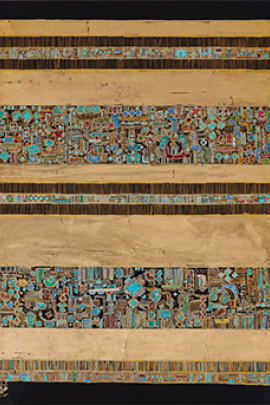 Issue du graphisme et du design, l’artiste iranienne Negin Rouhbakhsh propose une œuvre singulière mêlant la peinture et le travail de la feuille d’or. La géométrie des formes et les couleurs chatoyantes et irisées habillent des toiles aussi imposantes que délicates.
