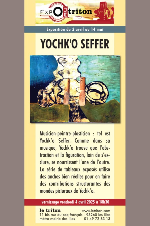 Musicien-peintre-plasticien : tel est Yochk’o Seffer. Comme dans sa musique, Yochk’o trouve que l’abstraction et la figuration, loin de s’exclure, se nourrissent l’une de l’autre. La série de tableaux exposés utilise des anches bien réelles pour en faire des contributions structurantes des mondes picturaux de Yochk’o.