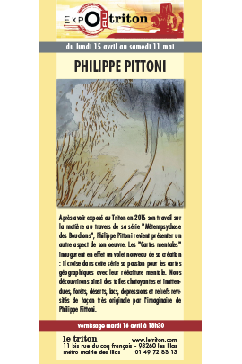 Après avoir exposé au Triton en 2016 son travail sur la matière au travers de sa série "Métempsychose des Bouchons", Philippe Pittoni revient présenter un autre aspect de son oeuvre. Les "Cartes mentales" inaugurent en effet un volet nouveau de sa création : il croise dans cette série sa passion pour les cartes géographiques avec leur réécriture mentale. Nous découvrirons ainsi des toiles chatoyantes et inattendues, forêts, déserts, lacs, dépressions et reliefs revisités de façon très originale par l'imaginaire de Philippe Pittoni.