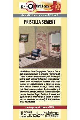 « Diplômée de l’école d’art graphique Corvisart à Paris et après quelques années dans la sérigraphie, l’imprimerie puis l’édition, je reviens à la peinture. Animée par le désir de représenter le monde contemporaintransfiguré parune visionpersonnelle. Attirée par le patrimoine, les édifices et lieux reconnaissables qui semblent immuables et intemporels. Inspirée par les bâtiments et quartiers délaissés, à l’abandon, oubliés, voués à être transformés ou détruits. Avec la volonté de représenter l’intérêt graphique, émotionnel et esthétique qu’ils peuvent avoir. En utilisant des jeux d’ombres et de lumières et en opposant ce qui est évident à ce qui est subjectif, je veux donner à mes compositions plus de relief, de force et de dimension. » Priscilla Sement