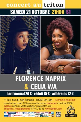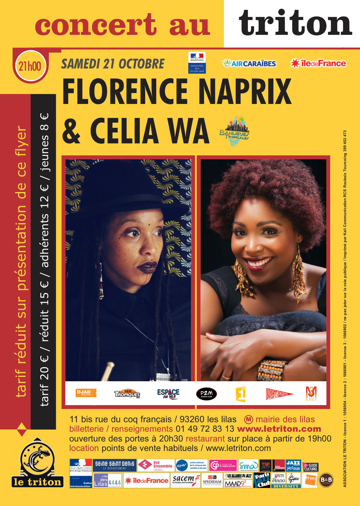 Florence Naprix et Célia Wa ont en commun un parcours musical riche. Tantôt déferlante, tantôt caressante, toujours empreinte d’une force puisée aux racines de son histoire et de son parcours, la voix de Florence Naprix nous charroie de rivages en contrées rarement explorées. Sa musique se nourrit des rythmes et chants de la Caraïbe, mais pas seulement. Elle ouvre grand les bras au reste du monde. Car pour elle, l’art n’existe qu’une fois passées les frontières.