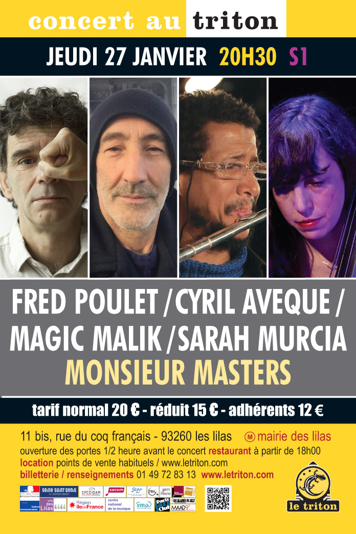 Ce soir, ils ouvrent leur duo intimiste pour la toute première fois sur scène en y conviant deux de leurs plus fidèles et “vieux” camarades, par ailleurs bien connus des habitués du Triton : le génial Magic Malik et la non moins brillante Sarah Murcia. Monsieur Masters is born !