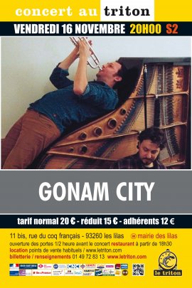 Gonam City est né de la rencontre de deux fortes têtes musicales : Quentin Ghomari, trompettiste fondateur du groupe Papanosh, poète de l’instrument et alchimiste sonore ; et Marc Benham, pianiste cérébral et fougueux que l’on connaît pour ses premiers disques en solo, et que l’on pourrait définir comme un « strideman spatial », autant influencé par James P. Johnson que par Sun Ra. Après avoir joué ensemble au sein de plusieurs orchestres, les deux amis décident de partager leur goût commun pour le « Middle Jazz » et les improvisations libres. Ils se lancent dans un premier essai en duo ; volcanique et impressionnant de télépathie. Le groupe finit finaliste du concours Jazz Migration 2018, parrainé par Philippe Ochem (Jazzdor Strasbourg-Berlin). Face à cet engouement, il semble urgent d’enregistrer un disque et de trouver un écrin à la hauteur de leurs aspirations musicales. Leur rencontre avec Stephen Paulello, l’un des tout derniers facteurs de pianos français encore en activité, est alors décisive. Ce dernier a mis au point un prototype extraordinaire : l’Opus 102, piano de 102 notes (au lieu de 88) qui permet aux deux musiciens de pousser l’exploration sonore de leurs instruments à son maximum, et qui confère à l’album GONAM CITY une couleur atypique. Les titres se développent tel un road trip musical au milieu d’un monde varié, décloisonné, d’où jaillissent autant de compositions originales que de standards-clins d’œil revisités avec malice.
