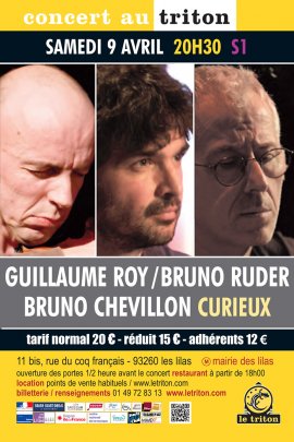 Voici en quelques mots ce qui motive la rencontre inédite entre Bruno Chevillon, Bruno Ruder et Guillaume Roy, trois grands habitués de nos scènes, que l’on a eu la chance de voir jouer au Triton depuis près de 20 ans, dans d’innombrables groupes et projets. Une grande première qui promet de belles étincelles sonores !