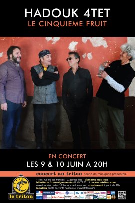 Les 4 esprits libres du Hadouk ont parcouru le monde, écouté son flot en s’affranchissant des frontières et du temps pour absorber la matière musicale aux 4 points cardinaux : l’orient (des rythmes gnawa aux maqams arabes), l’Occident (du rock aux musiques noires américaines), le Nord (des musiques celtes aux aires sino-japonais), le Sud (du blues malien aux transes ancestrales). Ouverts à tous les airs ils puisent les mélodies de la terre pour alimenter leur musique, fluide. D’abord source fluette, plus loin torrent, cascade puis fleuve, estuaire nourricier, la musique Hadoukienne célèbre la vie, fête le métissage, rend hommage aux cultures du monde. Très inspirés sur scène, Loy Ehrlich passe de la gumbass (gumbri basse) au Hajouj (basse gnawa) puis au Ribab (violon berbère), Didier Malherbe survole l’espace à la flûte, au doudouk et au sax soprano. Eric Lörher éclaire la voie de sa guitare électrique et Jean-Luc Di Fraya conte le récit à la batterie et au chant. Pionniers du métissage jazz et world, le Hadouk poursuit ainsi avec énergie son élégant voyage démarré il y’a 20 ans. Au printemps 2017 paraîtra Le Cinquième Fruit (Naïve), 9ème album du groupe. Plus électrique, rappelant parfois le Gong de Didier Malherbe, il y’est sujet d’une rencontre : le premier fruit symbolise le regard ; le second fruit incarne la parole ; le troisième, le toucher ; le quatrième représente le baiser ; le cinquième fruit reste à imaginer...