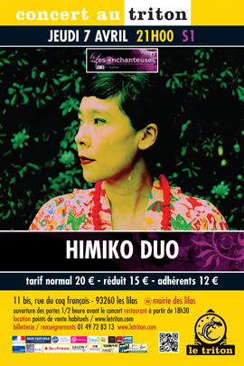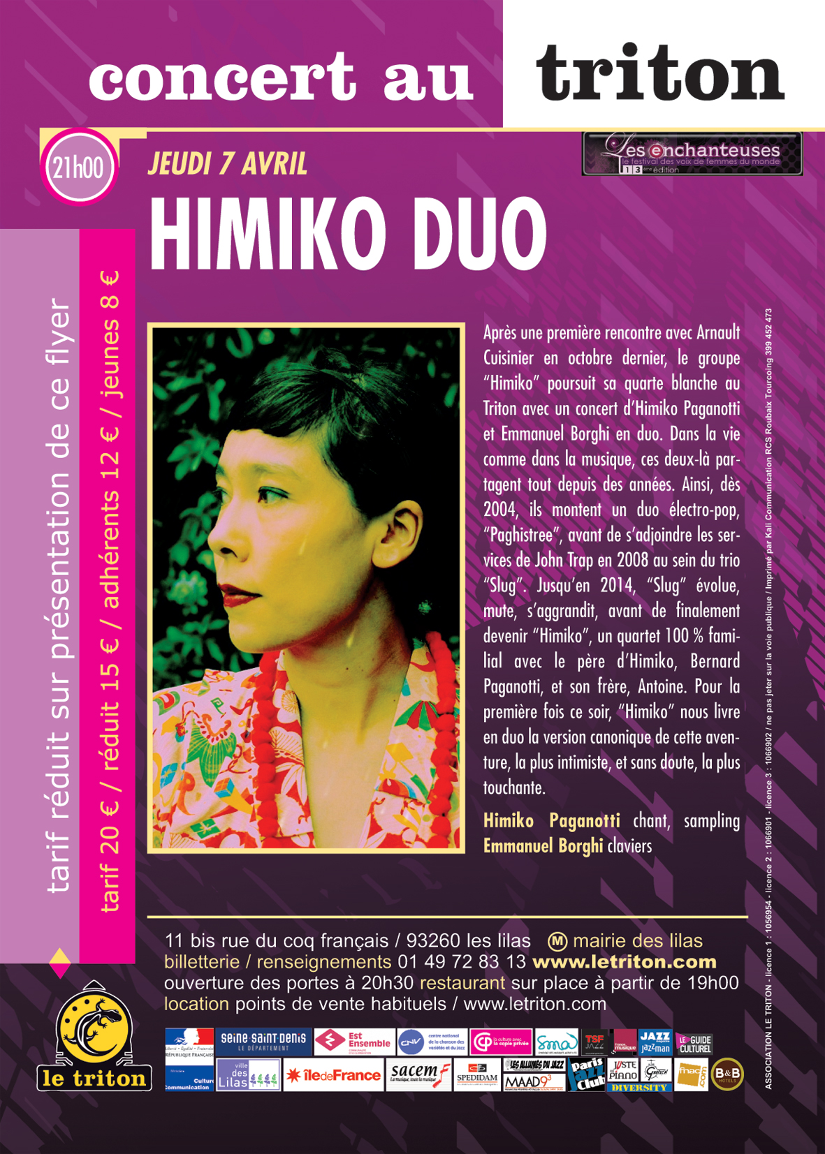 Après une première rencontre avec Arnault Cuisinier en octobre dernier, le groupe "Himiko" poursuit sa quarte blanche au Triton avec un concert d’Himiko Paganotti et Emmanuel Borghi en duo. Dans la vie comme dans la musique, ces deux-là partagent tout depuis des années. Ainsi, dès 2004, ils montent un duo électro-pop, "Paghistree", avant de s’adjoindre les services de John Trap en 2008 au sein du trio "Slug". Jusqu’en 2014, "Slug" évolue, mute, s’aggrandit, avant de finalement devenir "Himiko", un quartet 100% famillial avec le père d'Himiko, Bernard Paganotti, et son frère, Antoine. Pour la première fois ce soir, "Himiko" nous livre en duo la version canonique de cette aventure, la plus intimiste, et sans doute, la plus touchante.