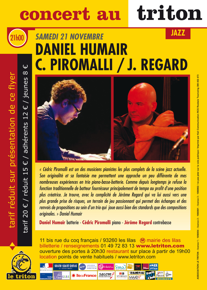 « Cédric Piromalli est un des musiciens pianistes les plus complets de la scène jazz actuelle. Son originalité et sa fantaisie me permettent une approche un peu différente de mes nombreuses expériences en trio piano basse batterie. Comme depuis longtemps je refuse la fonction traditionnelle de batteur fournisseur principalement de tempo au profit d’une position plus créatrice, je trouve, avec la complicité de Jérôme Regard qui va lui aussi vers une plus grande prise de risques, un terrain de jeu passionnant qui permet des échanges et des renvois de propositions au sein d’un trio qui joue aussi bien des standards que des compositions originales. »