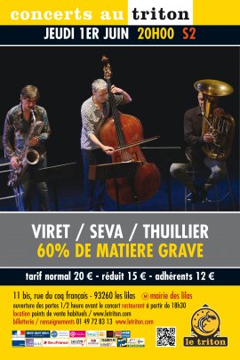 Réunion au sommet de trois musiciens qui, contrairement à leurs instruments, n’engendrent rien de grave. Le trio se propose d’explorer avec un sens aigu de la légèreté l’univers infini de la matière grave. Cette rencontre privilégiée entre un cuivre, un bois et des cordes permet à chacun d’assumer à tour de rôle la fonction fondamentale de son instrument et de mettre en évidence la grâce et les qualités d’expression trop souvent méconnues de ceux qu’on appelle les “gros” au sein de l’orchestre. “60% de matière grave” pourrait s’apparenter à la première ligne en Rugby ; un hommage aux fondations qui permettent au beau jeu de se déployer à l’aile.