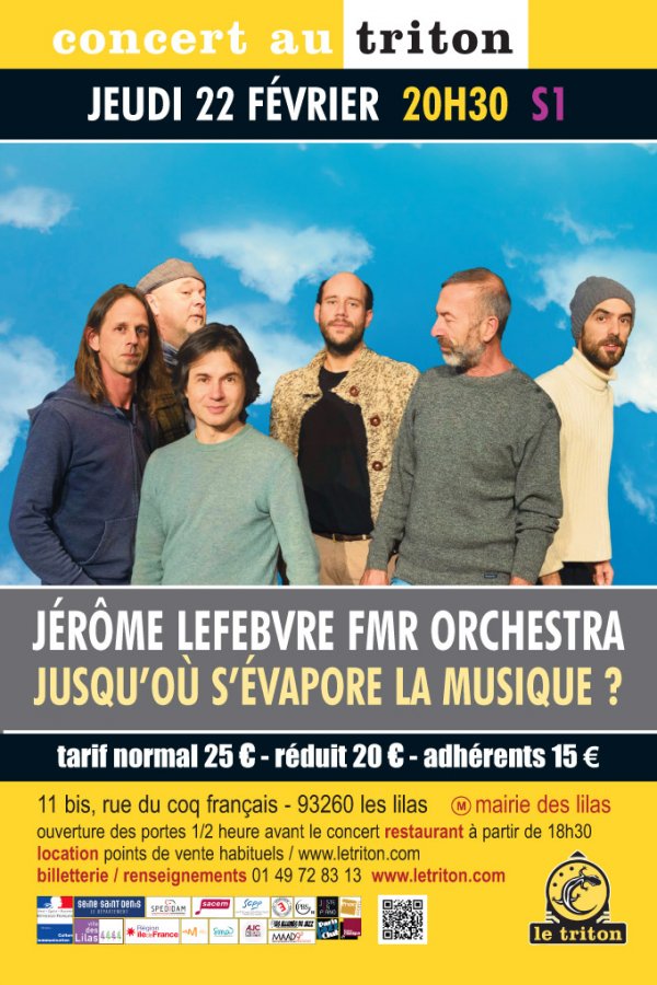 FMR Orchestrâ fêtera au Triton la sortie de l’album "Jusqu’où s’évapore la musique ?" Dans cette suite musicale un brin déjantée, Jérôme Lefebvre joue avec la musique en explorant différentes façon de composer. Ses compagnons aux univers multiples s’emparent de son écriture avec sensibilité et font sonner l’orchestre avec talent et originalité. Notes, rythmes, bruits et flux se déploient avec humour et finesse, et ce réjouissant sextet donne lieu à un éclectisme joyeux qui nous permet d’être au monde, ensemble, libres et maintenant. Toute la beauté précieuse de l’éphémère...