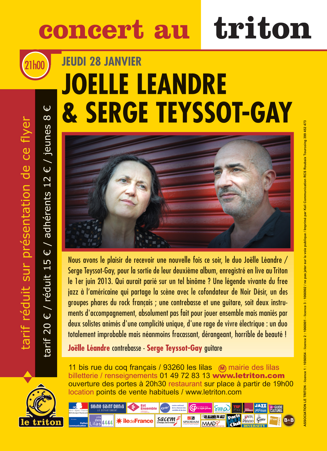 Nous avons le plaisir de recevoir une nouvelle fois ce soir, le duo Joëlle Léandre / Serge Teyssot-Gay, pour la sortie de leur deuxième album, enregistré en live au Triton le 1er juin 2013. Qui aurait parié sur un tel binôme ? Une légende vivante du free jazz à l’américaine qui partage la scène avec le cofondateur de Noir Désir, un des groupes phares du rock français ; une contrebasse et une guitare, soit deux instruments d'accompagnement, absolument pas fait pour jouer ensemble mais maniés par deux solistes animés d'une complicité unique, d'une rage de vivre électrique : un duo totalement improbable mais néanmoins fracassant, dérangeant, horrible de beauté !