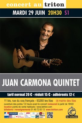 Reconnu comme l'une des plus grandes figures du flamenco, Juan Carmona collectionne les prix internationaux et les tournées à travers le monde. Créatif et curieux, sa soif d’apprendre semble insatiable et l’amène à ce qu’il est aujourd’hui : l’un des meilleurs guitaristes de sa génération. Les pieds dans la terre de ses ancêtres et la tête dans la modernité, tel est Juan Carmona : intemporel, insaisissable, indéniablement flamenco. Accompagné de son quintet, Juan Carmona livre une lecture ardente et moderne d’un flamenco jazz libre de fioritures qui forge sa spécificité. « Juan Carmona apparaît aujourd'hui par sa fluidité mélodique, la richesse de ses conceptions harmoniques, la fougue et la précision de son sens rythmique comme le guitariste dont le flamenco avait besoin après la disparition du grand Paco de Lucia. » Jazz Mag « Le maestro de la guitare flamenca manie parfaitement les contrastes et sait fédérer les esprits en fusion autour de ses rythmiques sophistiquées. » Télérama