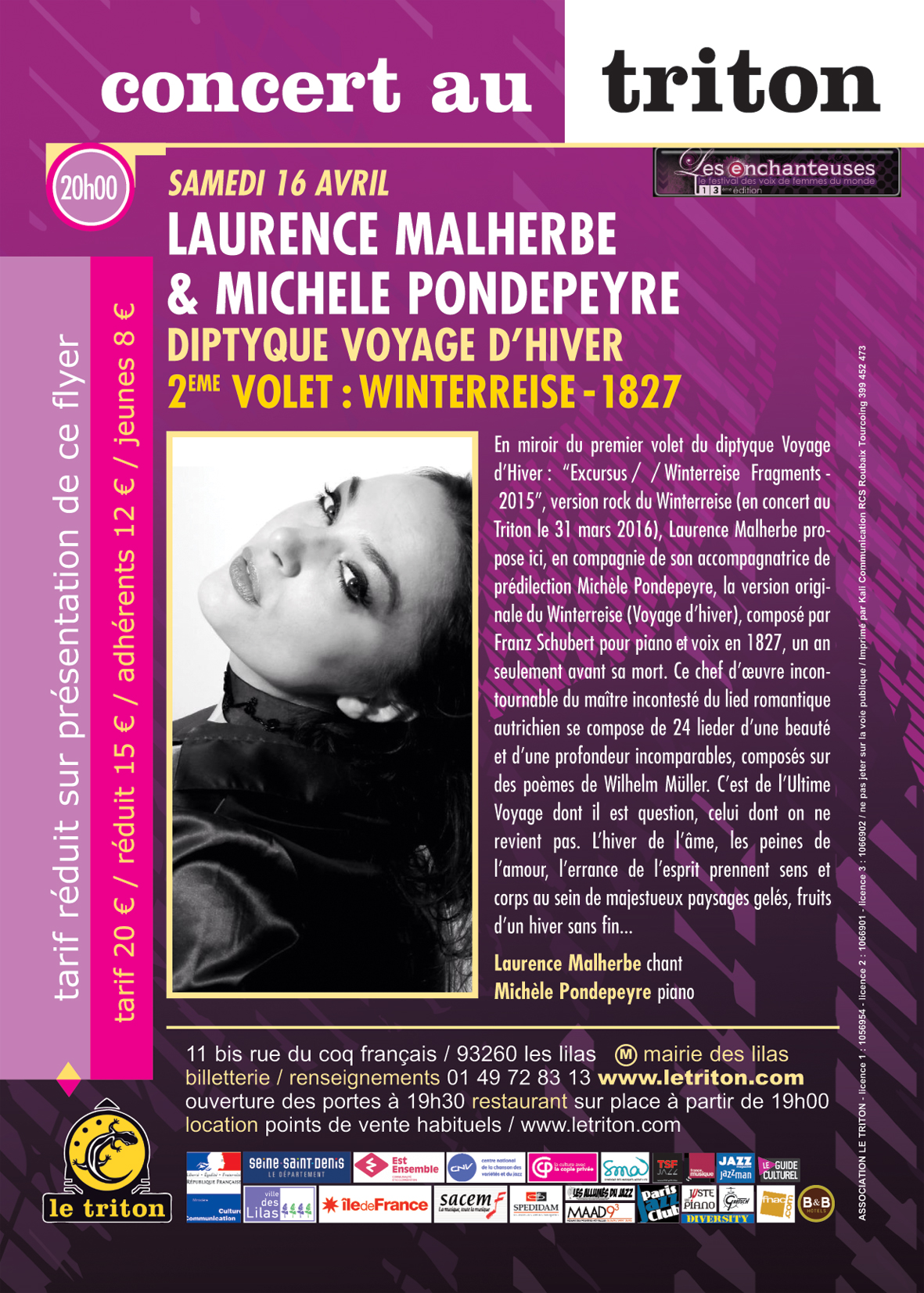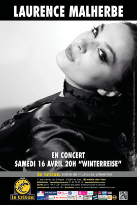 En miroir du 1er Volet du Diptyque - Voyage d’Hiver : "Excursus // Winterreise Fragments - 2015", version Rock du Winterreise (en concert au Triton le 31 mars 2016), Laurence Malherbe propose ici, en compagnie de son accompagnatrice de prédilection Michèle Pondepeyre, la version originale du Winterreise (Voyage d’hiver), composé par Franz Schubert pour piano et voix en 1827, un an seulement avant sa mort. Ce chef d’œuvre incontournable du Maître incontesté du lied romantique autrichien se compose de 24 Lieder d’une beauté et d’une profondeur incomparables, composés sur des poèmes de Wilhelm Müller. C’est de l’Ultime Voyage dont il est question, celui dont on ne revient pas. L’hiver de l’âme, les peines de l’amour, l’errance de l’esprit prennent sens et corps au sein de majestueux paysages gelés, fruits d’un hiver sans fin…