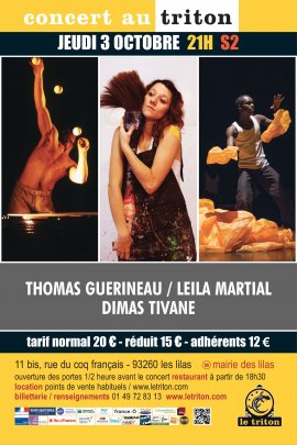 La rencontre se fera à la croisée des corps, des sons et des objets. Leila Martial, Thomas Guérineau et Dimas Tivane se rencontrerons 3 fois avant la soirée du 3 octobre pour faire connaissance. La rencontre risque d'être surprenante entre une vocaliste, clown, performer et 2 artistes faisant du jonglage musical. Thomas Guérineau improvise entre autre sur une timbale symphonique, Dimas Tivane jeune artiste mozambicain tourne depuis 5 ans dans le spectacle de jonglage musical "Maputo-Mozambique".